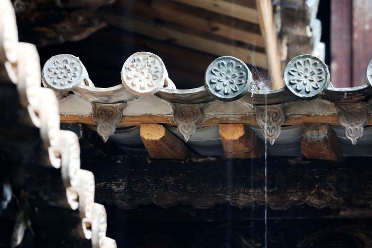 聰慧的中國工匠們利用樸實(shí)小瓦做出各種瓦花墻。杭州城永福寺的瓦花墻內(nèi)墻外風(fēng)光旖旎。晉中票號(hào)的東家們使用瓦花防盜,精湛技藝的匠人疊小瓦層層相扣成銅錢形,日常是票號(hào)的裝飾,任風(fēng)吹雨打,瓦自巋然不動(dòng)。若是蟊賊攀爬,在不均勻受力作用下,瞬間分化瓦解。紅河建水的黃氏宗祠小青瓦對(duì)花成屋脊,別樣姿容。