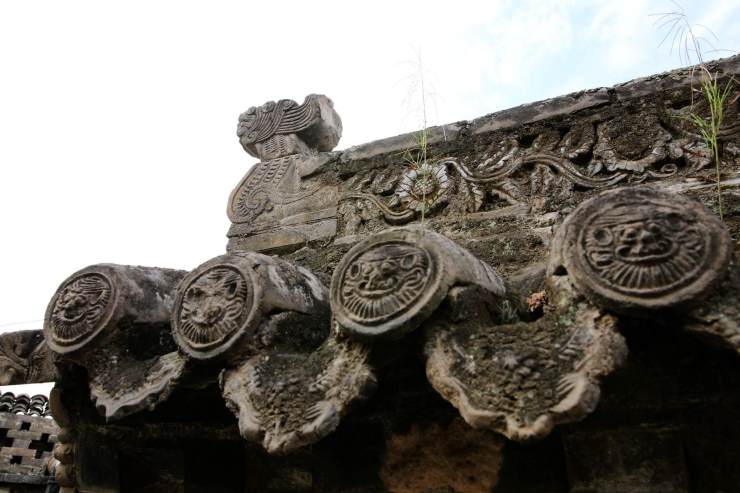 瓦當(dāng)、屋脊跟挑角是瓦中多彩美貌的成員。瓦當(dāng),古代建筑中覆蓋建筑檐頭筒瓦前端的遮擋,又名封頭瓦。她起始于東漢和西漢時(shí)期,用以裝飾美化和蔽護(hù)建筑物檐頭的建筑附件。瓦當(dāng)上刻有文字、圖案,有云頭紋、幾何形紋、饕餮紋、文字紋、動(dòng)物紋等等,為精致的藝術(shù)品,屬于中國古典建筑特有的形制,多是圓型。