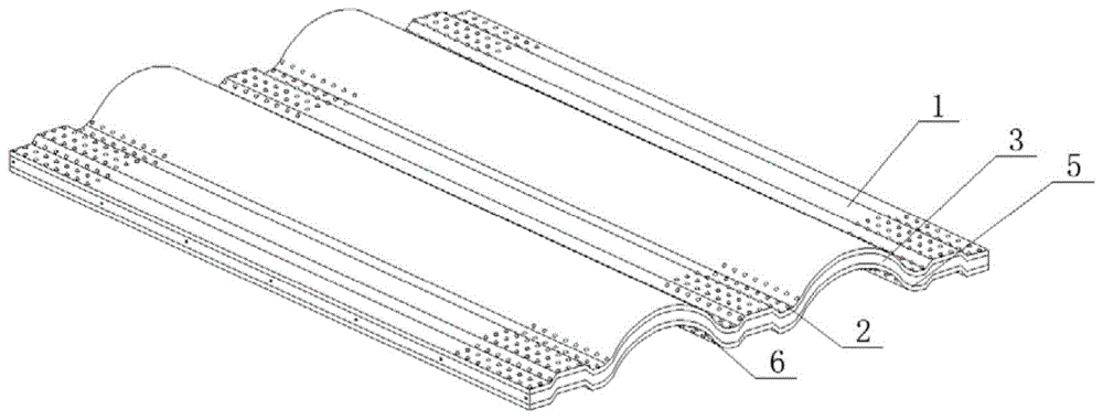 圖中:1、頂層樹脂瓦;2、頂部防滑凸點(diǎn);3、隔熱層;4、支撐架;5、底層樹脂瓦;6、底部防滑凸點(diǎn)。