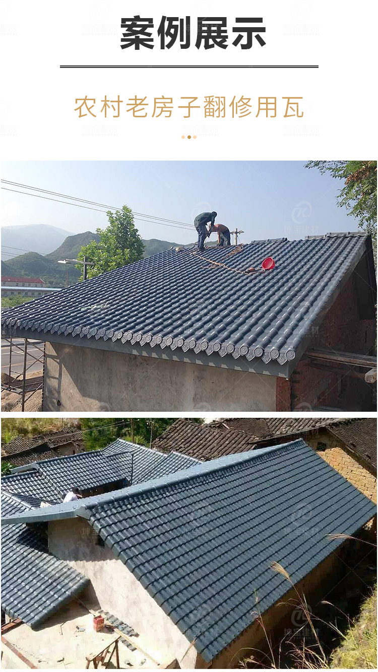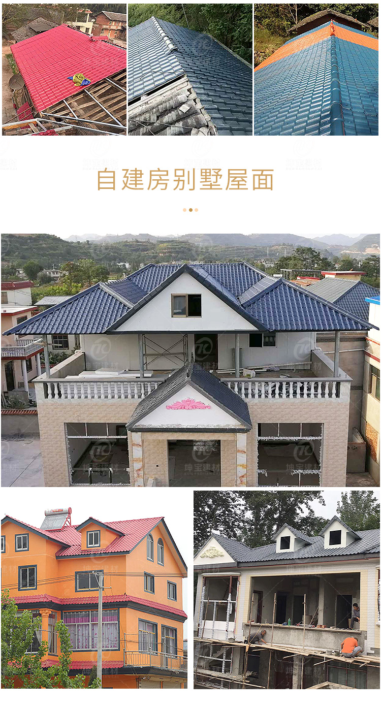 合成樹脂瓦在總結國內(nèi)外同類產(chǎn)品經(jīng)驗的基礎上進行了創(chuàng)新,它突出的特點是色彩豐富并經(jīng)久不褪,造型美觀立體感強且符合中國建筑文化特色。同時它還具有質(zhì)輕、防水、堅韌、保溫、隔音、防腐蝕、抗風防震、抗冰雹、抗污染、防火、絕緣、安裝簡便等優(yōu)點,是各類建筑表面裝飾和防水的理想材料平改坡工程。