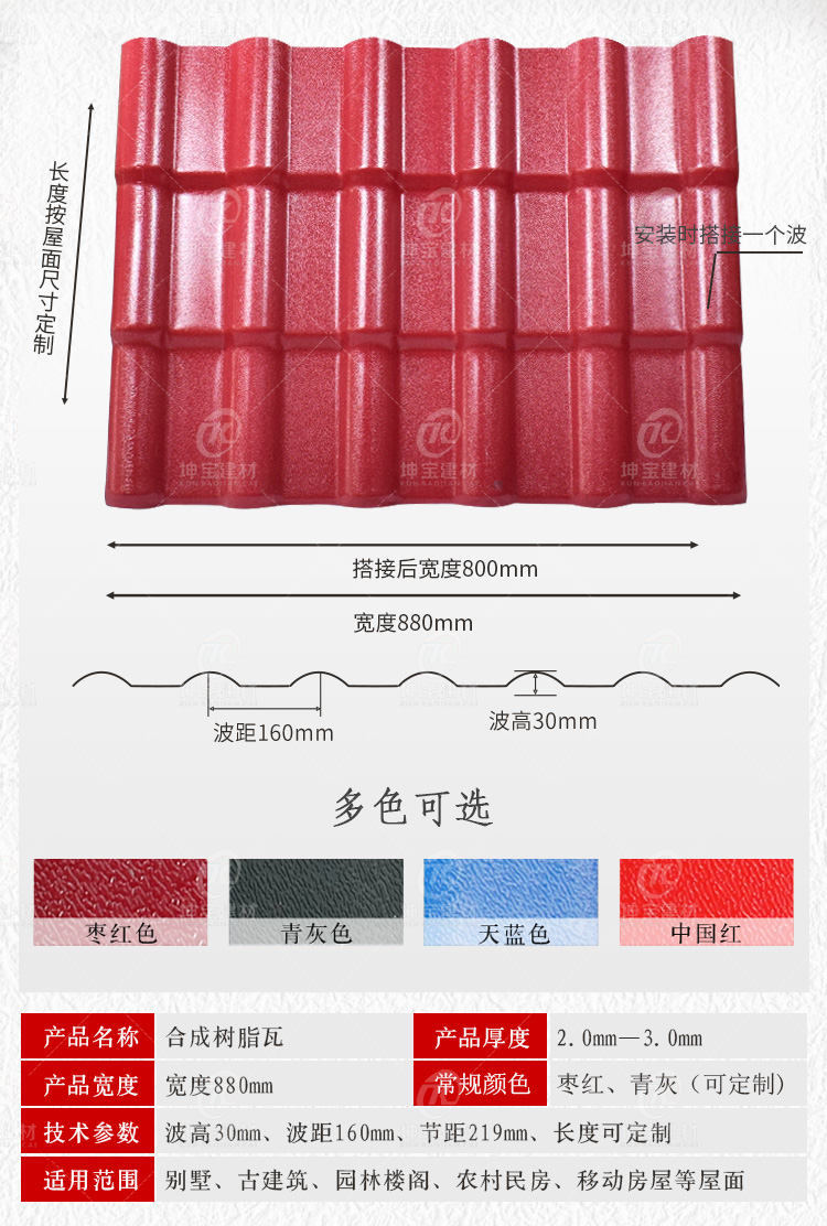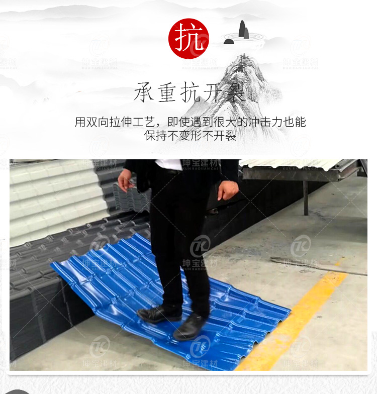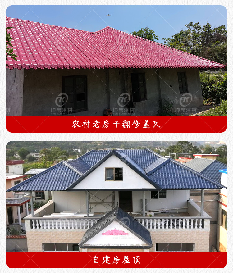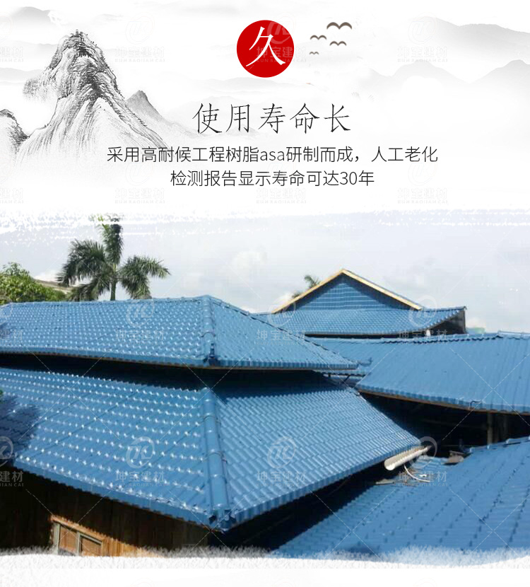 坤寶合成樹脂瓦采用高耐候ASA樹脂、韌性骨架層和高強度PVC耐磨層三層共技壓制而成,特點是色彩豐富并經久不褪,造型美觀立體感強且符合中國建筑文化特色。同時它還具有質輕、防水、堅韌、保溫、隔音、防腐蝕、抗風防震、抗冰雹、抗污染、防火、絕緣、安裝簡便等優(yōu)點,是各類建筑表面裝飾和防水的理想材料,尤其適用于我國目前大力推廣的平改坡、新農村建設、新城鎮(zhèn)化、別墅屋面、民用建筑等屋面。